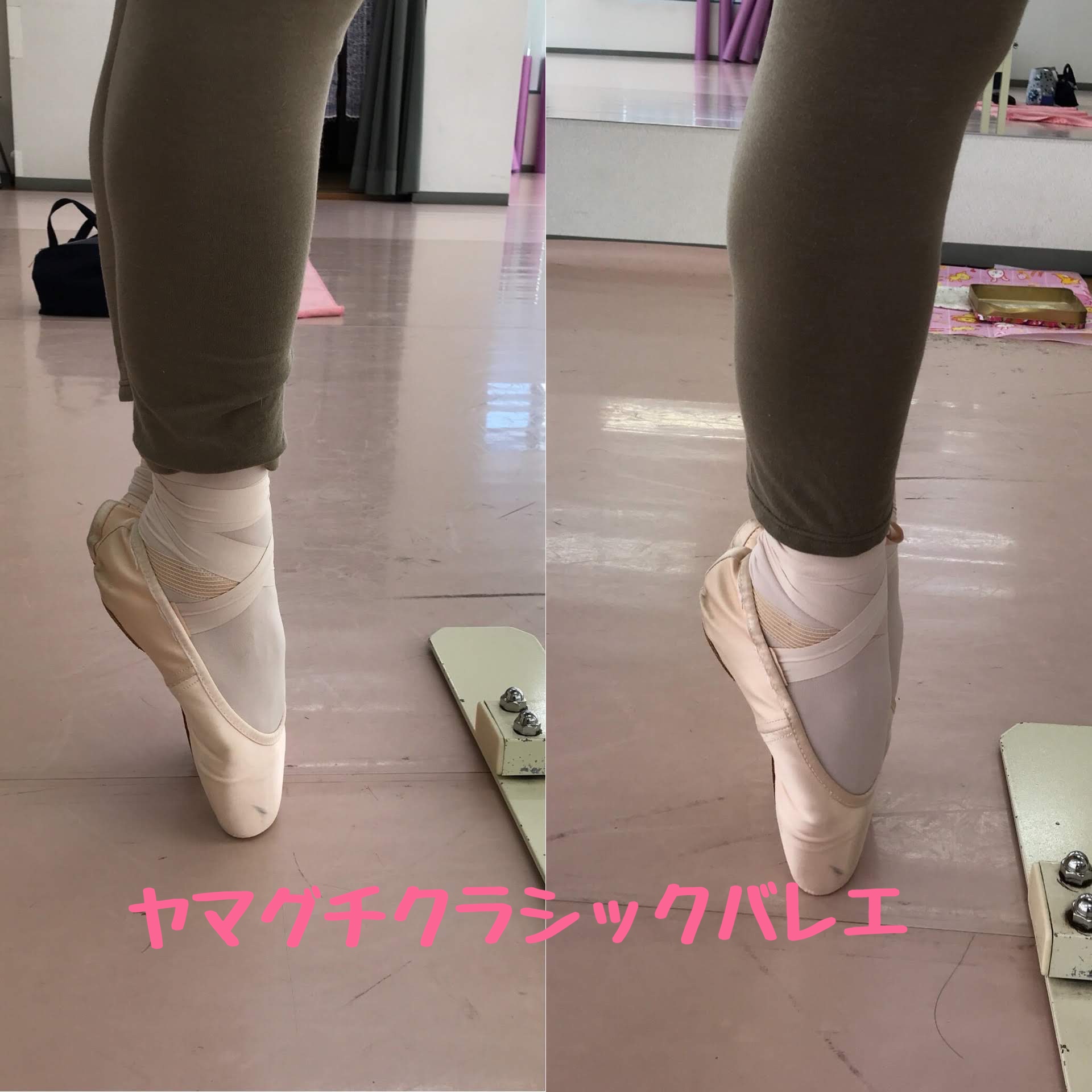 先日の初めてのポワントクラスで引き上げと突き刺すのやり方を説明した時もセラバンドを使いました!2mのセラバンドは使い勝手がとても良いです。